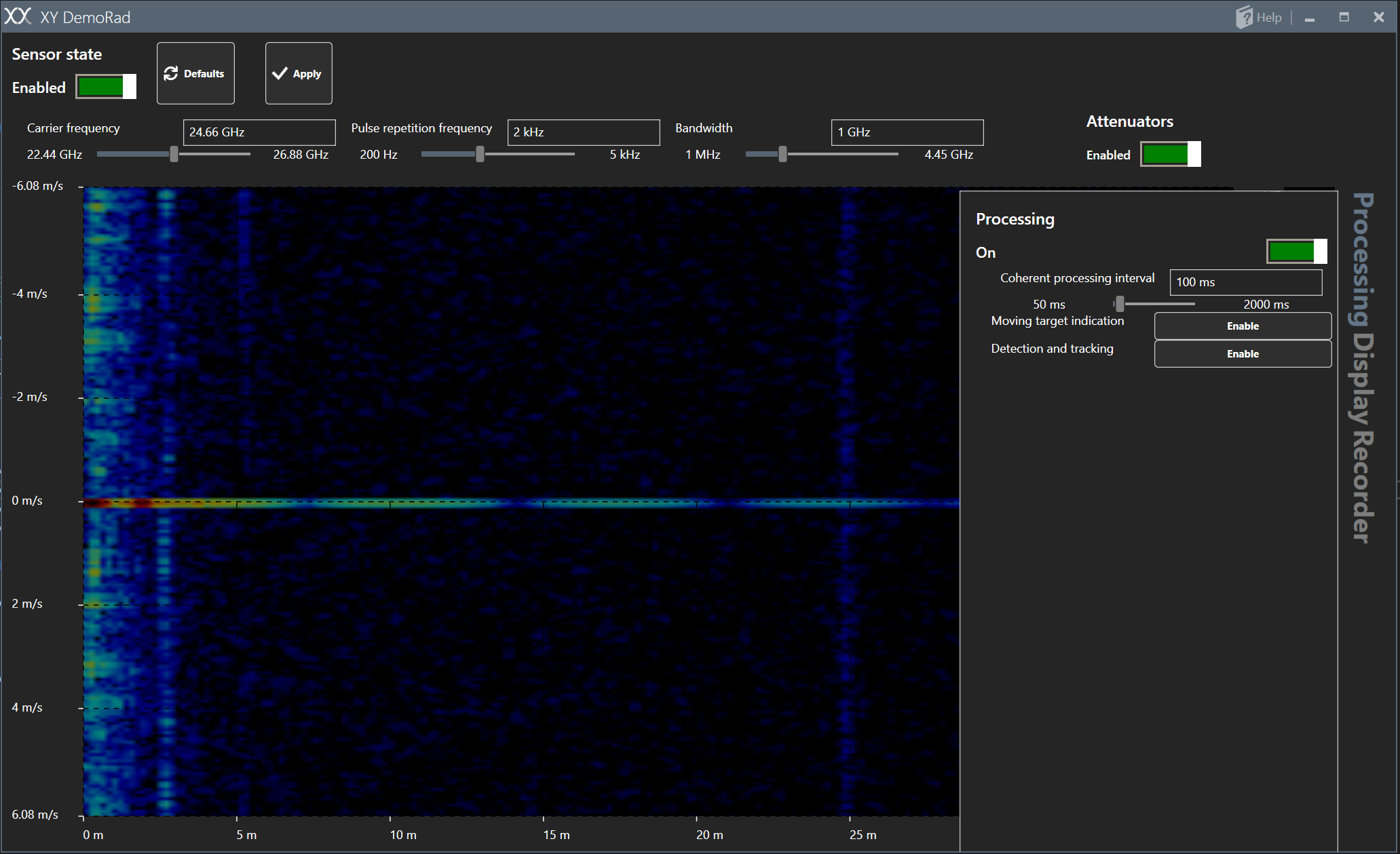XY-DemoRad to radar FMCW (Frequency-Modulated Continuous-Wave) z liniową modulacją fali (Linear Frequency Modulation – LFM ). XY-DemoRad pozwala użytkownikowi na dostęp do surowych danych pomiarowych, które mogą być przechowywane na dysku twardym celem dalszego przetwarzania lub przetwarzania w czasie rzeczywistym. Dołączona w zestawie aplikacja wspiera oba rodzaje przetwarzania.