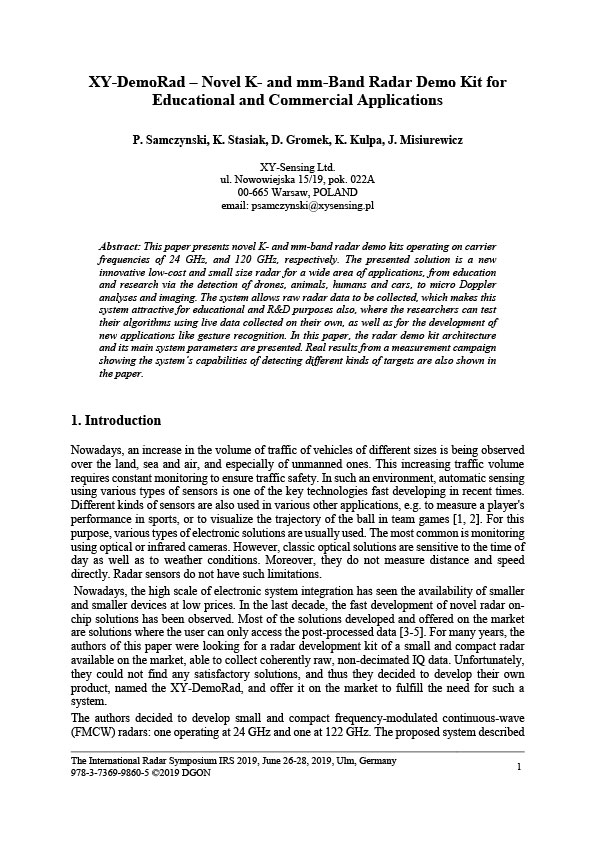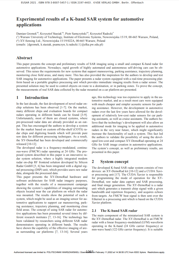 D. Gromek, K. Stasiak, P. Samczyński, K. Radecki, „Experimental results of a K-band SAR system for automotive applications“, 2021 13th European Conference on Synthetic Aperture Radar (EUSAR), Leipzig, Germany, 2021