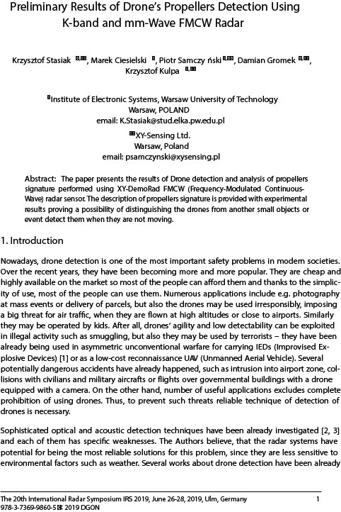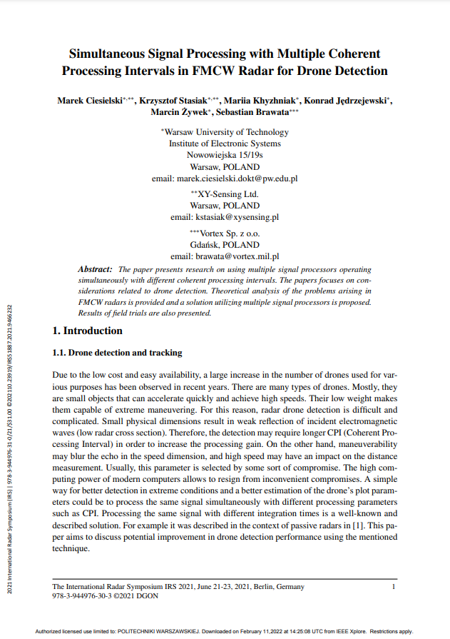 Maciej Wielgo, Damian Gromek, Piotr Samczyński, Krzysztof Stasiak, Karol Abratkiewicz, Marek Gaweł, „Low- Cost High-Resolution SAR Imaging on Drone“, the paper submitted for the publication in Proc. of the 2021 CIE International Conference on Radar, Haikou Hainan, China, 2021