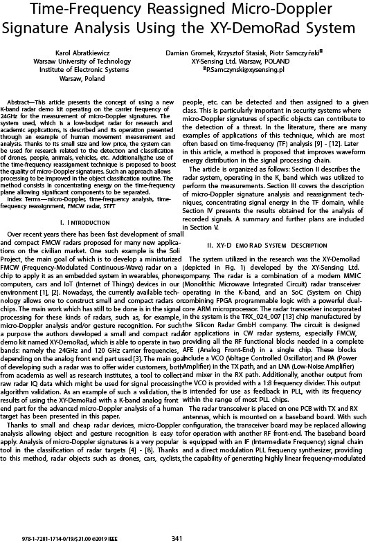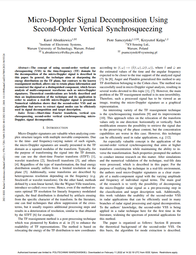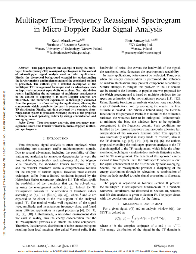 K. Abratkiewicz, P. Samczyński, „Multitaper Time-Frequency Reassigned Spectrogram in Micro-Doppler Radar Signal Analysis“ in 2021 Signal Processing Symposium (SPSympo), Łódź, Poland, 2021
