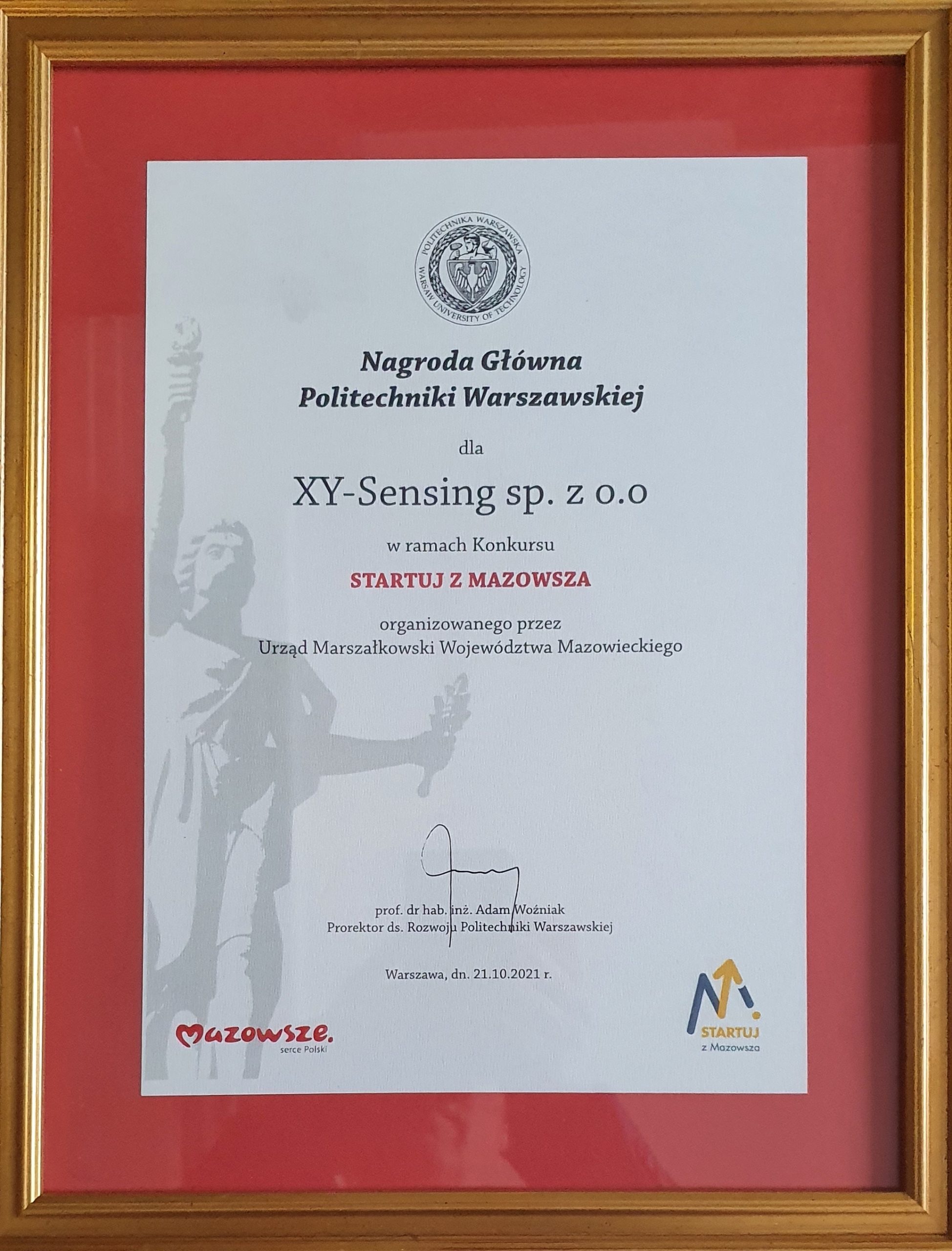 Main Award of the Warsaw University of Technology for XY-Sensing sp.z o.o. as part of the STARTUJ Z MAZOWSZA competition. 11 of the best startups out of 55 participating in the competition, including XY-Sensing, qualified for the finals of the competition.