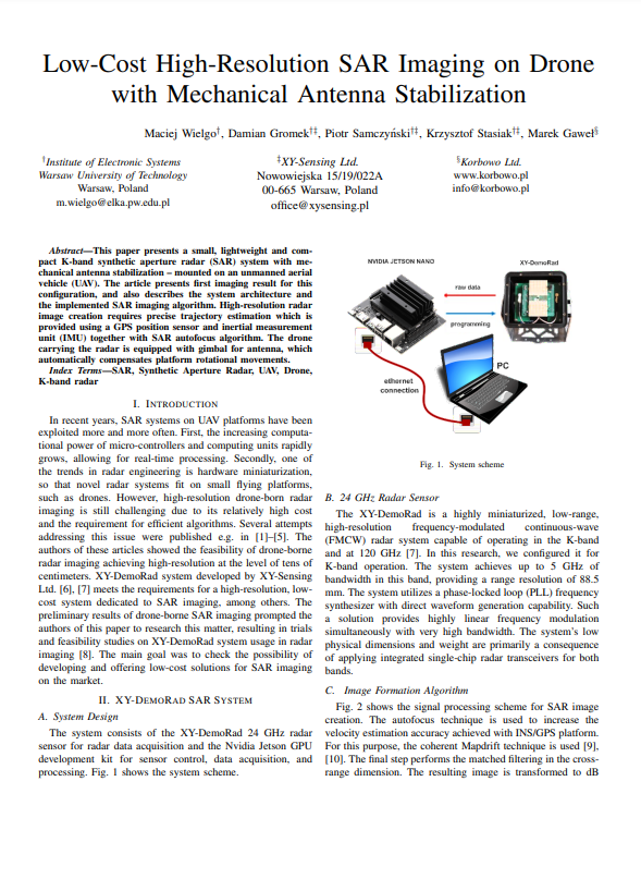 Maciej Wielgo, Damian Gromek, Piotr Samczyński, Krzysztof Stasiak, Karol Abratkiewicz, Marek Gaweł, „Low- Cost High-Resolution SAR Imaging on Drone“, the paper submitted for the publication in Proc. of the 2021 CIE International Conference on Radar, Haikou Hainan, China, 2021